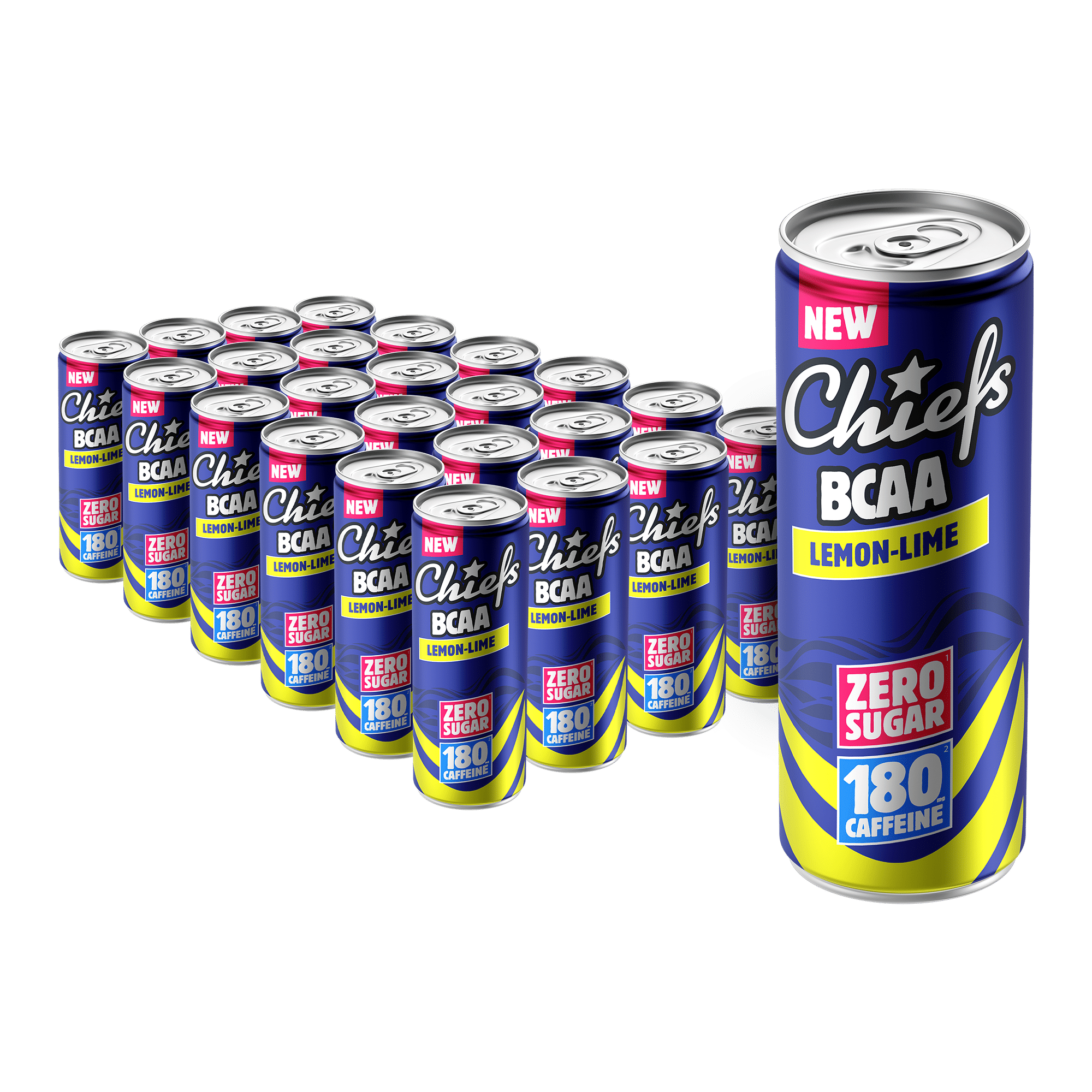 Caffeinated and carbonated drink with BCAAs (branched chain amino acids) and vitamins, with sweeteners. Pasteurised. Lemon & lime flavour.